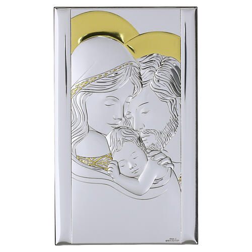 Pannello religioso con soggetto Sacra Famiglia inciso su lastra bilaminato in argento, con finiture oro e base in legno.