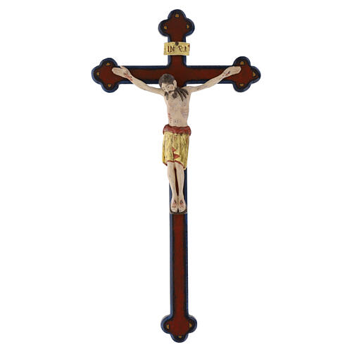 Crocefisso dipinto, in legno d'acero, realizzato manualmente da artigiani specializzati della Valgardena, secondo la migliore tradizione artistica locale. Gli artigiani e gli artisti scolpiscono il legno dei boschi alpini e lo dipingono con maestria in ogni minimo particolare, donando particolarità uniche.