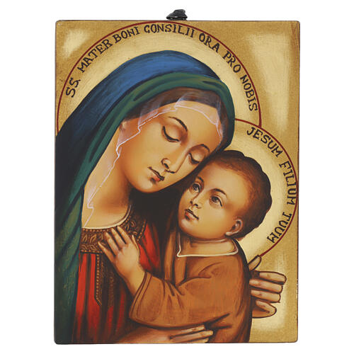 Questa icona Rumena della Madonna del Buon Consiglio è stata dipinta interamente a mano su tavola secondo la tradizione dell'iconografia bizantina. L'immagine raffigura la Vergine Maria che accoglie il Bambino Gesù, rappresentati con i volti accostati in un gesto di intima dolcezza, tipico dell'arta sacra orientale. Il culto della Madonna del Buon Consiglio ebbe particolare diffusione durante il pontificato di Leone XIII, che nel 1884 riconobbe ufficialmente la festa liturgica e lo scapolare bianco della Mater Boni Consilii, concedendo anche indulgenze. Da quel momento la devozione si è estesa in molte parti del mondo grazie all'impegno degli Agostiniani e ai pellegrini che, nei secoli, hanno visitato il Santuario di Genazzo, diffondendo l'immagine come segno di fede.