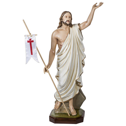 Gesù Risorto 100 cm fiberglass per esterni. La Statua del Gesù Risorto è realizzata in fiberglass, in Italia presso una ditta con lunga esperienza nella realizzazione di arredi sacri, dipinte a mano con vernici a olio. La Statua è finemente lavorata, viso, mantello, vesti, capelli, sono curati in ogni particolare e dettaglio.