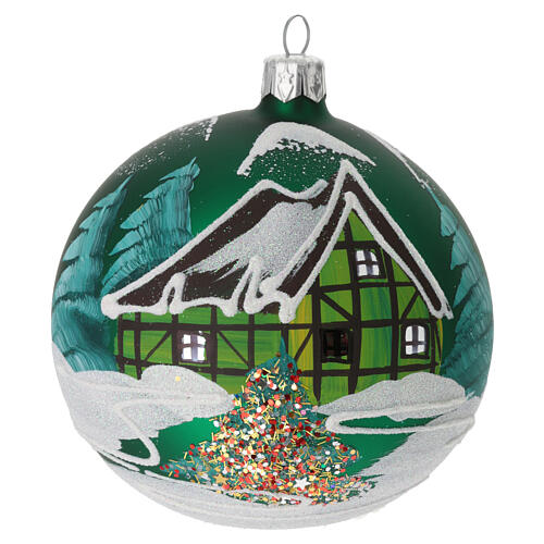 Pallina Albero vetro verde baita scandinava innevata 100 mm