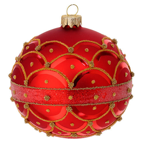 Pallina Natale vetro soffiato rosso satinato decorata glitter oro 100 mm