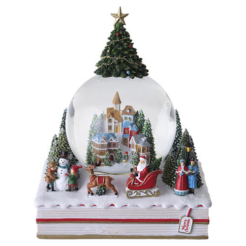 Sfera natalizia decorativa con effetto neve e carillon integrato con scena paesaggio natalizio con personaggi.