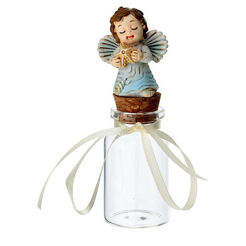 Bottiglietta in vetro trasparente con tappo decorativo angioletto in resina, pensata come bomboniera per battesimo, comunione e ricorrenze religiose.