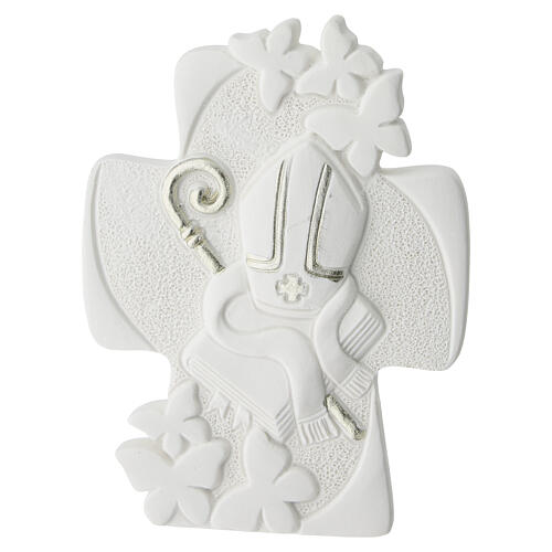 La struttura presenta sagoma a croce con applicazioni frontali raffiguranti mitra pastorale e bastone vescovile, finitura effetto pietra e supporto posteriore integrato per stabilità su superfici piane.